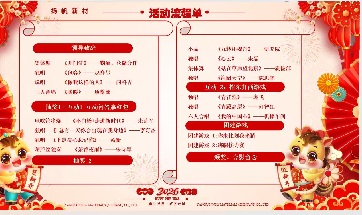 本次元旦匯演的成功舉辦,彰顯了揚(yáng)帆新材料以員工為本的企業(yè)文化,也為新一年的奮斗注入了蓬勃?jiǎng)恿?。展?/span>2026年,公司將繼續(xù)秉持“仁德創(chuàng)富,成己惠人”的價(jià)值觀,在新材料領(lǐng)域再創(chuàng)輝煌。